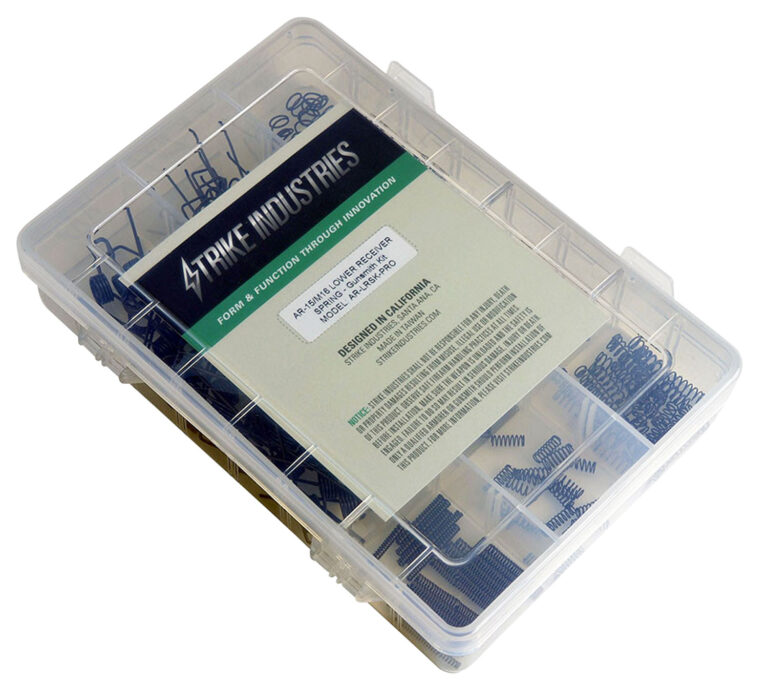 The Strike Industries AR-15 lower Receiver spring replacement kit includes 9 important springs that are commonly replaced or easily lost when building stripped AR-15 lower receivers. The 9-Piece kit includes springs for the bolt catch, disconnector, buffer retainer, trigger, hammer, magazine catch, selector, and two detents.