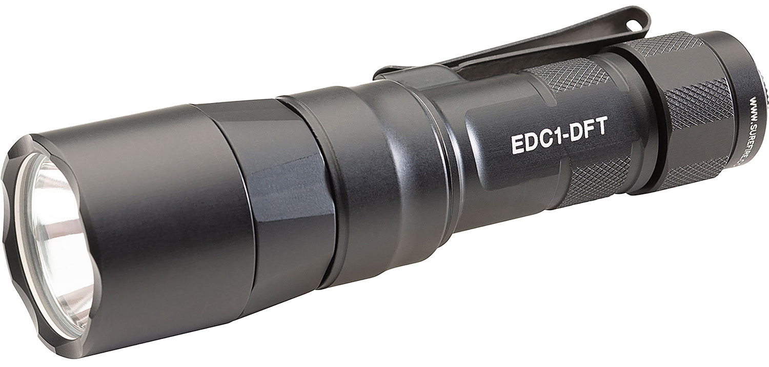Turbocharge Your Low-Light Vision. SureFire’s Everyday Carry Series punches deep into darkness with the EDC1-DFT, a Dual Fuel, high-candela handheld flashlight that delivers impressive beam designed explicitly for long-distance illumination in a remarkably compact form factor. With a blinding, peak beam intensity of 95,000 candela using the included SF18350 rechargeable lithium-ion battery or 55,000 candela from a single 123A primary battery, the EDC1-DFT’s concentrated, tightly focused beam pattern allows you to see farther into the darkness and positively identify any potential threat. In addition, it offers tremendous versatility by providing ample spill light to help the user maintain situational awareness. Constructed of lightweight aerospace aluminum, Mil-Spec hard-anodized, and O-ring sealed to keep out the elements, the body and tailcap are also knurled for a secure grip. A sturdy, two-way clip offers the added flexibility of bezel-up or bevel-down carry. The EDC1-DFT delivers SureFire quality, performance, and dependability in an everyday carry flashlight that provides peace of mind by helping you see farther into the unknown.