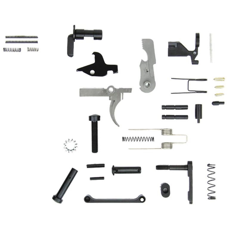 Tacfire AR-15 Lower Parts Kit contains: (1) Trigger Stainless Steel (1) Trigger Pin (1) Trigger Spring (1) Trigger Guard (1) Hammer Stainless Steel (1) Hammer Spring (1) Hammer Pin (1) Bolt Catch Roll Pin (1) Bolt Catch Spring (1) Detent Spring (1) Bolt Catch Plunger (1) Take Down Detent (1) Bolt Catch (1) Magazine Catch Spring (1) Magazine Catch Button (1) Magazine Catch (1) Front Pivot Pin (1) Detent Selector (1) Take Down Pin (1) Buffer Retainer Pin (1) Buffer Retainer Spring (1) Disconnector Spring (1) Disconnector (1) Selector (1) Selector Spring.
