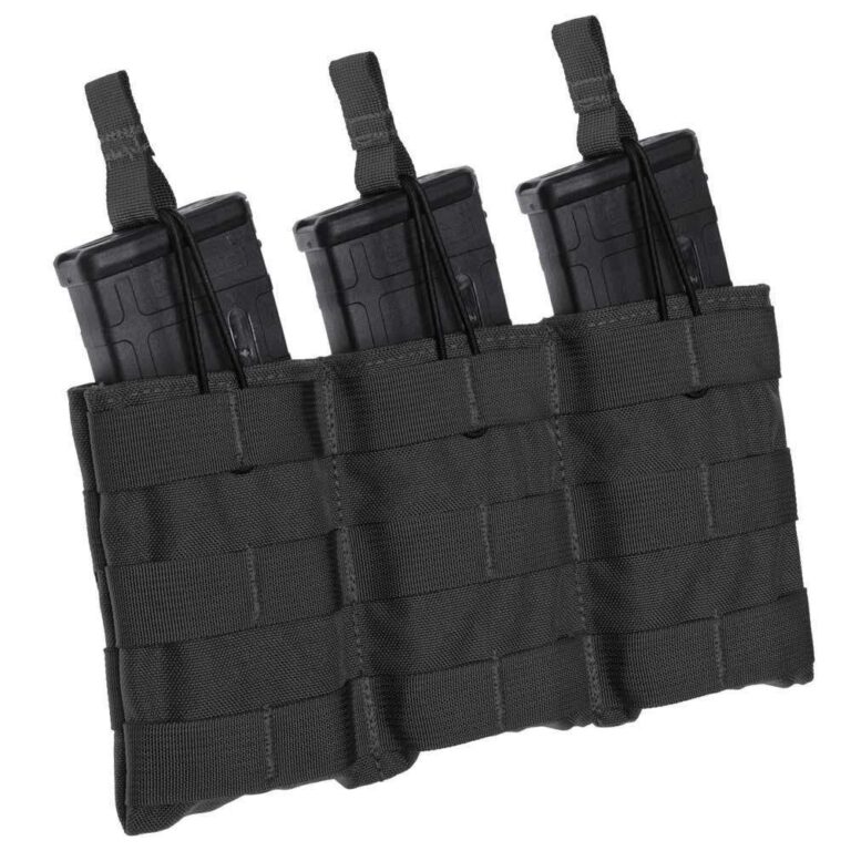Triple SPEED LOAD MOLLE Rifle Magazine Pouch is designed with durability and fast reloading of your rifle in mind. Constructed with tough 1000 Denier Nylon exterior and blackened grommets that serve as convenient drain holes. Magazines are retained with top quality elastic cords and convenient pull tabs. Just flip them over when needing quick access.
