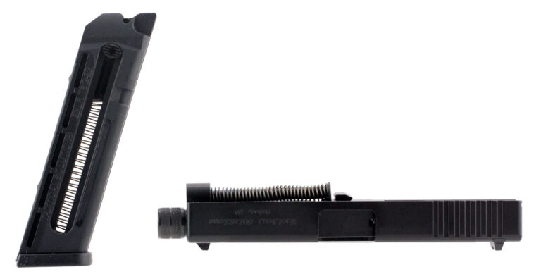 The TSG-22 quickly and easily converts to any generation, even generation 4 of the Glock models 19/23/32/38 into an accurate .22LR pistol. Machined from a solid piece of heat treated 4140 steel, the TSG-22 maintains a similar weight and feel to your factory Glock allowing realistic shooting and training. A nitride surface treatment offers superb resistance to wear and surface friction. The barrel has a 1:16″ twist and 1/2″x28 threads. It comes with factory Glock sights and includes a 10rd magazine.