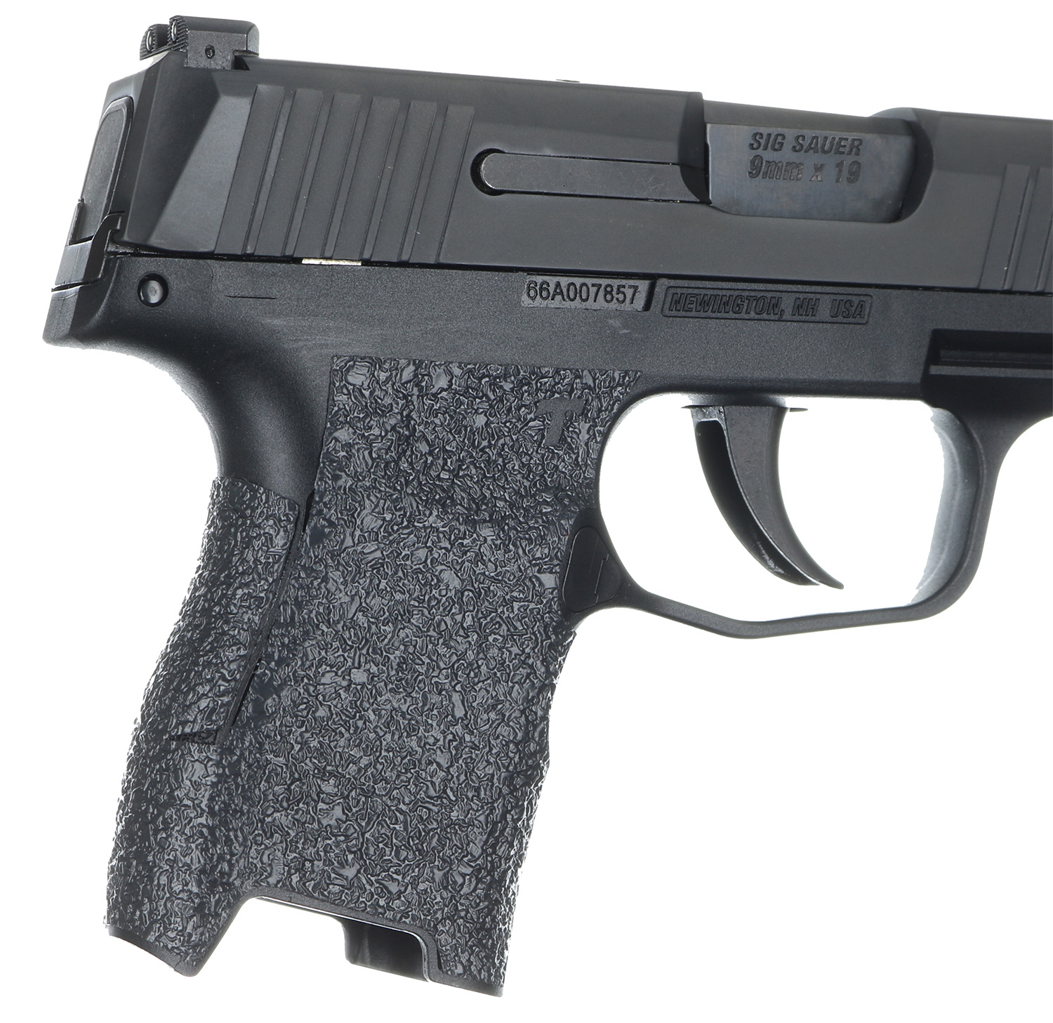 The Talon low profile grip is custom designed and manufactured for specific firearms to provide an OEM quality fit and finish, adding minimal bulk/size. Adhesive will not move once properly installed and can be easily removed with little to no residue. It is easy to install within minutes (proper installation requires a hair dryer or heat gun). Most cleaning solutions do not harm the grip (avoid aerosol-based solvents such as CLP). The rubber texture provides positive grip on the firearm and is more commonly used for concealed carry (less likely to irritate skin or snag on clothing) and users with softer hands. This rear wrap grip is made of a textured rubber and offers full side panel coverage including the thumb rest, trigger guard and high coverage on the backstrap. Made in the USA.