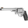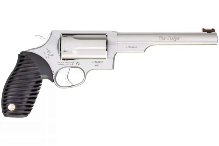 The Taurus Judge is named for the many judges who carry it into the courtroom for their protection, and it is capable of chambering both 410 gauge with 2-1/2″ shotshell and the 45 Colt. This combo is ideal for short distances where most altercations occur and for longer distances with the 45 Colt ammo. This model is fully customized with fixed rear sights, fiber optic front sights, and Taurus Ribber Grips. The safety features on this model include the Taurus Security System and a transfer bar. This model has a 6.5″ barrel with a stainless steel finish.