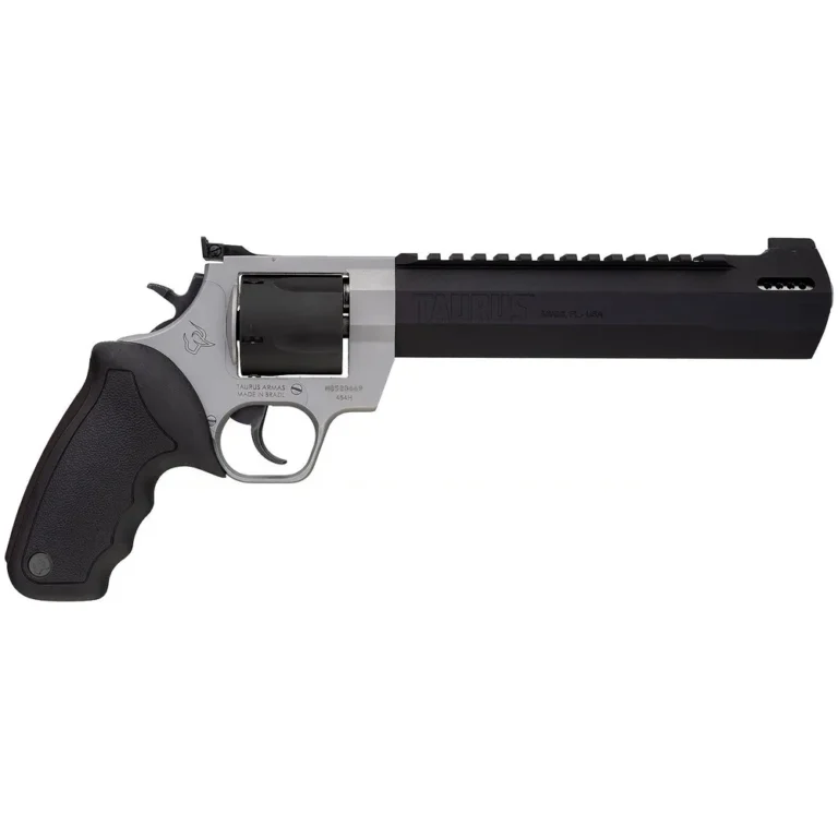 The Taurus Raging Hunter is a 454 Casull, 5-shot revolver. Its striking Stainless and Blue two-tone finish is enough to grab the attention of any big-bore aficionado, but the optics-ready Picatinny rail and angular barrel design will seal the deal. The unique barrel system incorporates a steel sleeve that is inserted into an aluminum housing that cuts down on the overall weight, making this a well-balanced hunting sidearm. The exclusive cushioned insert grips on the Raging Series large frame revolvers makes shooting them comfortable and controllable. Also aiding in recoil management is the unique placement of the factory-tuned porting and gas expansion chamber that is designed to disperse gases directionally-reducing muzzle lift and delivering quicker target acquisition. This built-to-last revolver is a fun and effective alternative for short to medium range hunting scenarios.