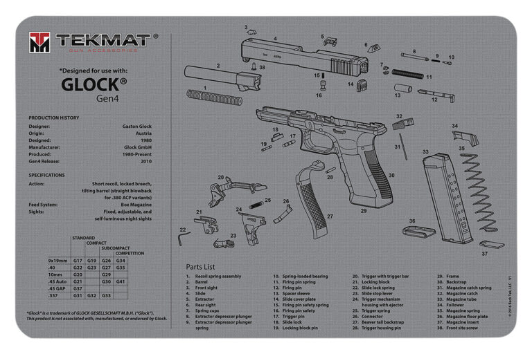 TekMat TEKR17GLOCKG4GY Glock Gen 4 Cleaning Mat Gray Rubber 11″x17″ Glock Gen 4 Parts Diagram