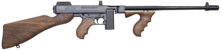 All the classic details of the time honored original are reproduced in today’s semi-auto Thompson 1927-A1. This .45 caliber carbine features a 16.5″ finned barrel and genuine American walnut woodwork. It has a blade front sight with an open rear adjustable sight. This Deluxe Semi-Auto model has a pinned compensator for an 18″ barrel length. The frame and receiver are machined from solid steel with a blued metal finish, and a fixed buttstock, pistol grip and vertical foregrip. It includes one 10-round stick magazine.