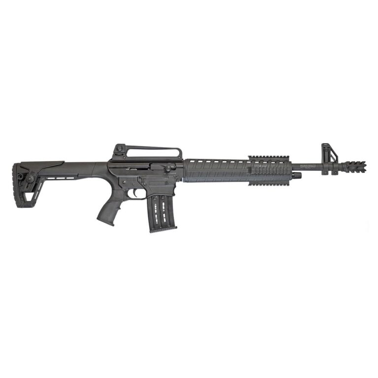 AR Style 12 ga gas operated semi auto shotgun featuring a 3" chamber 19.5" smooth bore barrel door breacher style muzzle brake polymer forend with picatinny rail sections pistol grip butt stock rear sight/carry handle and two magazines (2-and 5- shell). The two piece forend is easily removed for quick and easy access for cleaning.
