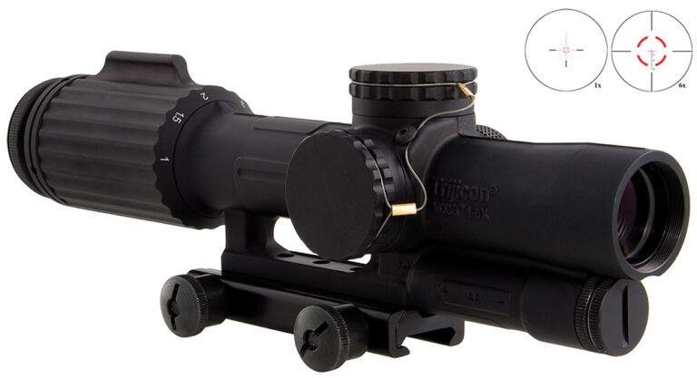 The Trijicon VCOG 1-6×24 LED riflescope accommodates close quarter battle (CQB) and long distance marksmanship. It features superior glass quality and light gathering capabilities with zero distortion, first focal plane reticle allows the sub tensions and drops to remain true at any magnification, offers 6 adjustable brightness settings for the LED reticle and constant eye relief. When powered by a lithium AA battery, it boasts a considerable battery life of 700 hours at a 4 setting (constant on). Waterproof for up to 20 meters (66ft), the VCOG comes standard with a quick-release mount for any 1913 Picatinny rail. Includes thumb screw mount, AA battery, LENSPEN, Trijicon logo sticker, manual and warranty card.