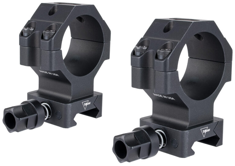 Trijicon Ring Mounts w/ Q-LOC Technology feature a 34mm tube, and are designed to keep the optic as low as possible for hunting and long range precision rifle applications. Featuring a Mil-Spec drop test rated 6061-T6 aluminum design and an easy to use one handed tool less mounting system. The spring-loaded design allows for constant retention and maintaining of zero even if the knobs are not tightened. The Ring mounts boast a low profile design with superior return to zero performance and are compatible with any Mil-Spec or NATO Picatinny rail. Designed specifically for variable power optics, these rings are perfect for mounting Trijicon variable power optics with an objective lens up to 56mm on any weapon platform with a full Picatinny rail.