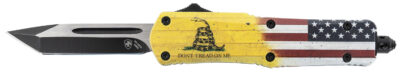 Templar Knife MDTOM331 Gen II Don’t Tread On Me Slim 3.50″ OTF Drop Point Plain Black Oxide Stonewashed 440C SS Blade, 5.05″ Yellow w/Flag & “Don’t Tread On Me” Aluminum Handle, Glass Breaker