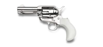 Taylors & Company 200061 1873 Cattle Brand Pietta 45 Colt (Long Colt) 6 Shot 5.50″ Nickel Engraved Round Barrel, Cylinder & Steel Frame, White PVC Navy Grip, Exposed Hammer